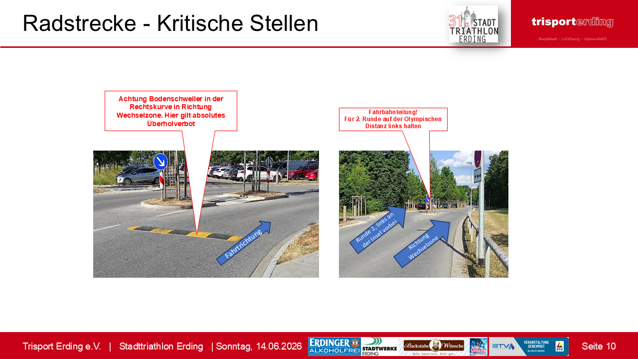 Der Streckenabschnitt vor der Fahrbahnteilung ist rund 100 Meter nach einer Kurve. Deshalb schaut Euch diesen Abschnitt auch auf der Karte und am Wettkampftag an. Wir weisen zudem darauf hin, dass es in besagter Kurve vor der Wechselzone Bodenschweller montiert, weshalb auch schon in dieser Kurve Vorsicht geboten ist.
