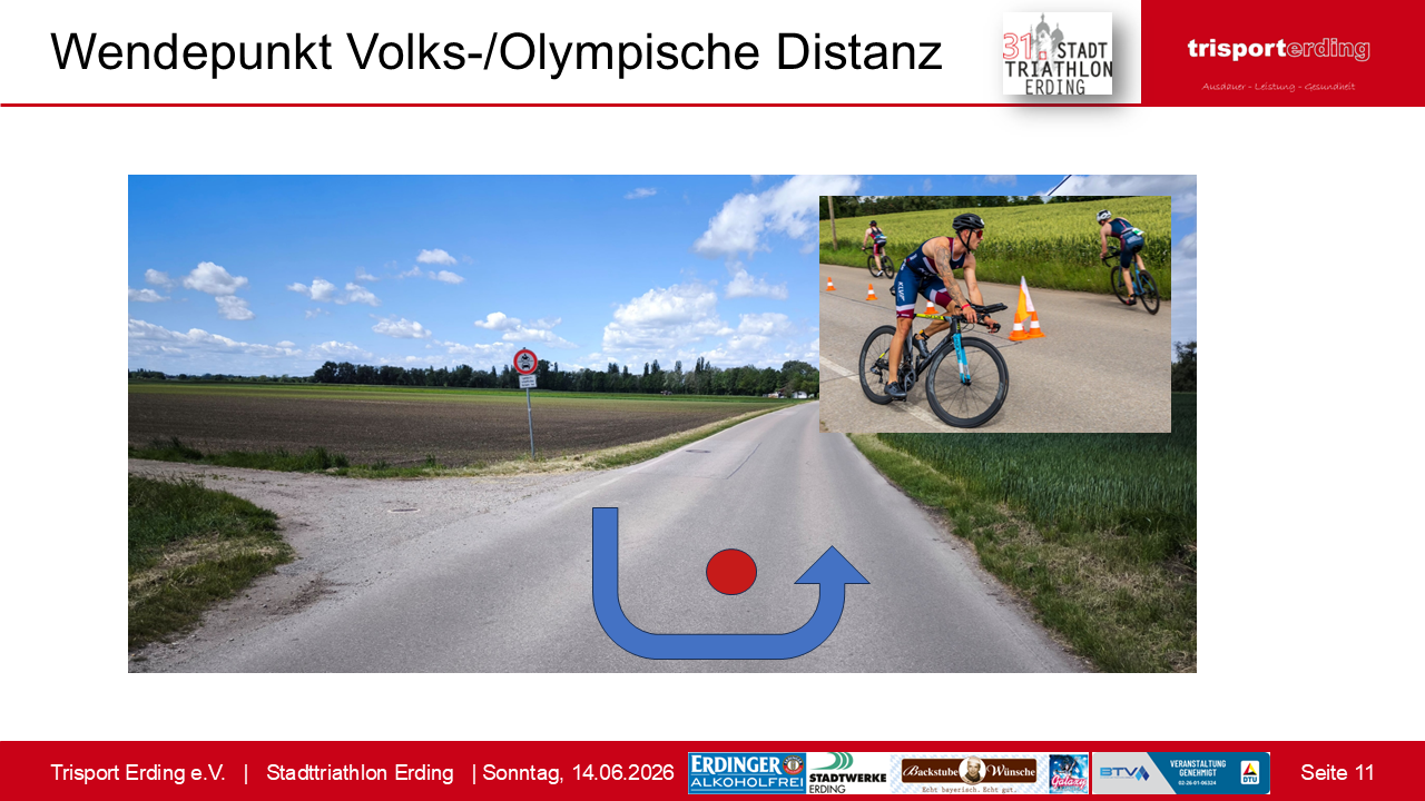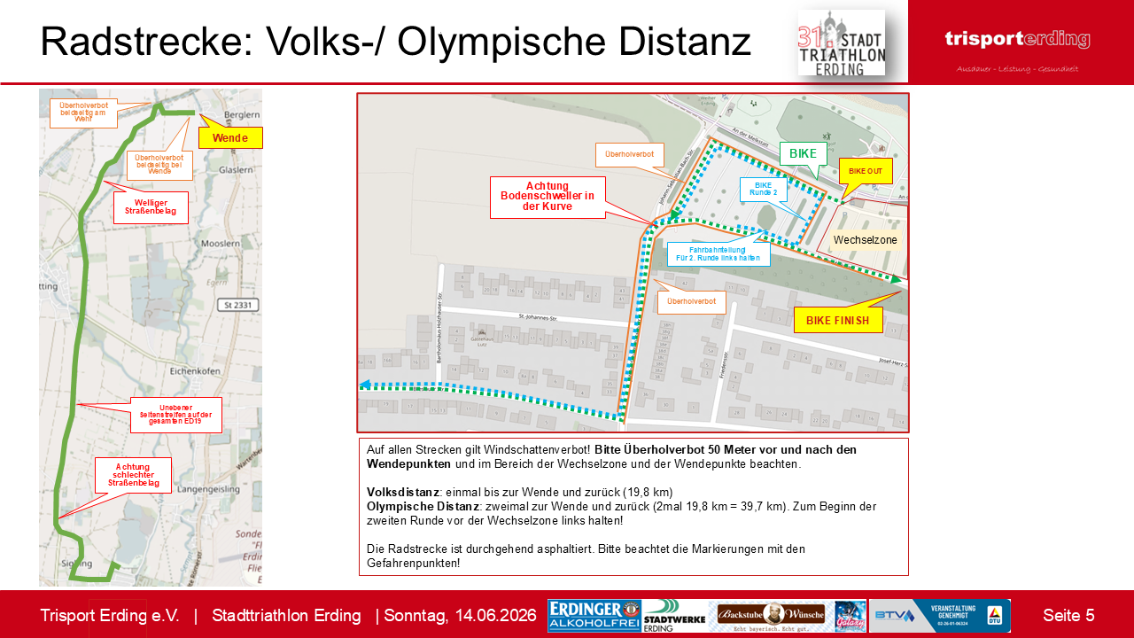 Die Radstrecken auf der Volks- und Olympischen Distanz verlaufen ausschließlich auf asphaltierten Straßen. Da die Radstrecken nicht voll gesperrt sind, gilt die StVO und Rechtsfahrgebot. Alle Radstrecken sind Wendepunktstrecken, wobei sich die Wendepunkte je nach Wertung unterscheiden. Auf der Olympischen Distanz muss die Wendepunktestrecke zweimal absolviert werden. Hierbei ist es wichtig, dass Ihr die Strecken- bzw. Fahrbahnteilung vor der Wechselzone beachtet, wenn es auf die zweite Runde geht.
