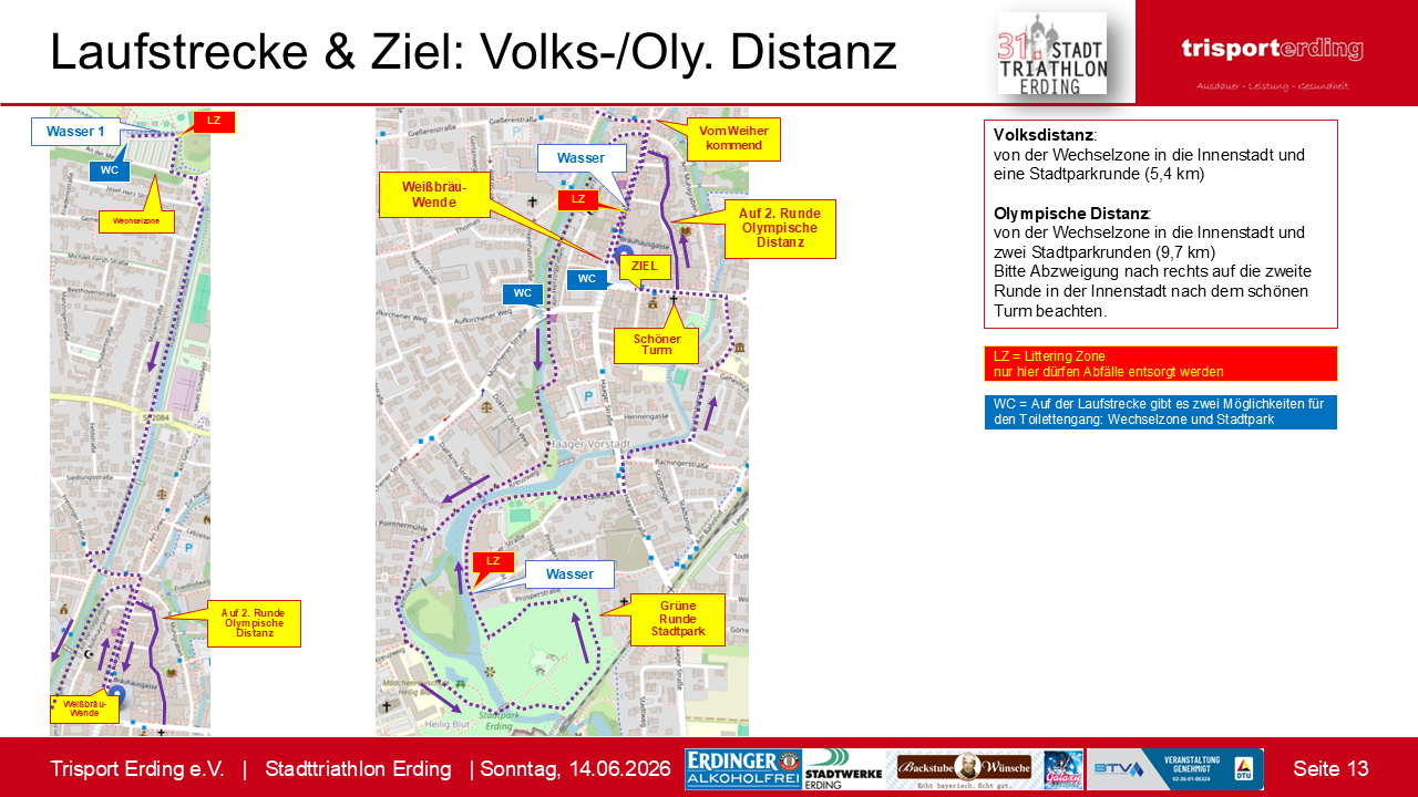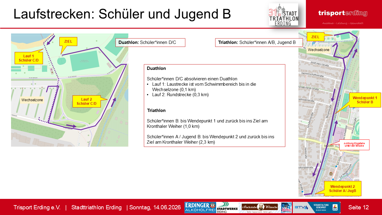 Zur Optimierung der Laufwege und Einhaltung der Streckenlängen haben wir den Laufweg für die Schüler*innen und Jugend B verändert. Die Kinder werden nach dem Abstellen des Rades direkt auf die Laufstrecke geleitet und müssen nicht mehr die Schleife durch die Wechselzone laufen. Bitte beachtet hier die unterschiedlichen Wendepunkte. Alle Teilnehmer in den Schülerklassen und Jugend B finishen den Wettkampf am Weiher und haben dort auch ihre Siegerehrung.