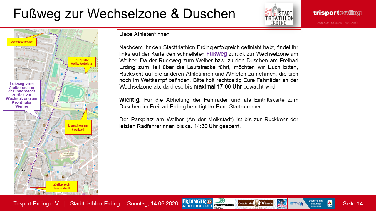Aufgrund der Streckensperrungen gibt es keinen Shuttle zur Wechselzone. Den kürzesten Weg findet Ihr auf der Karte. Bitte beachtet, dass ggf. noch Athleten auf der Strecke sind. Des weiteren möchten wir Euch bitten zeitnah Eure Räder auszuchecken (siehe Ausschreibung).