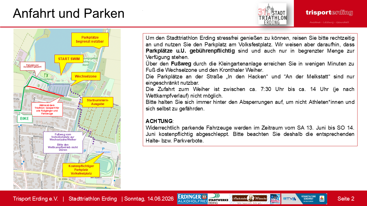 Zutritt zur Wechselzone ist ausschließlich auf der Ostseite beim Rad-Check-In. Der Ausgang ist auf der Nordseite beim Minigolfplatz.