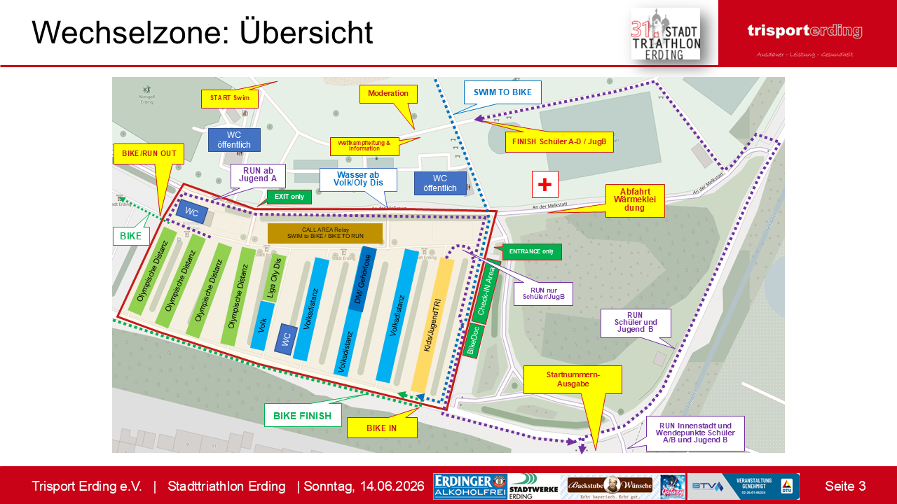 Dreh- und Angelpunkt im Triathlon ist die Wechselzone; und je mehr Teilnehmer am Start sein werden, desto komplexer sind die Laufwege. Zur besseren Lenkung von Teilnehmern und Zuschauern bitten wir Euch die Ein- und Ausgänge der Wechselzone zu beachten.