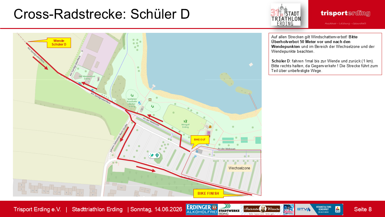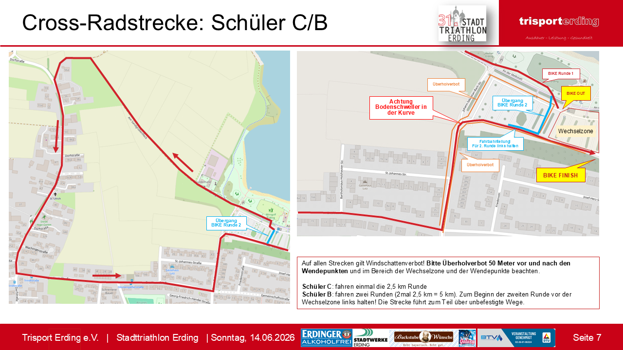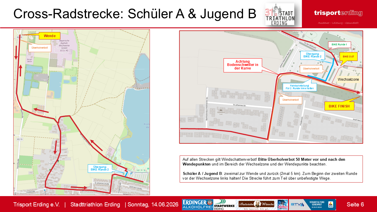 Ab 2026 werden die Wettkämpfe der Schüler und Jugend B als Cross-Veranstaltungen ausgetragen. Bitte beachtet deshalb die Fahrradwahl, da die Radstrecke zum Teil über unbefestigte Wege und ggf. Hindernisse führt. Bitte beahctet auch, das die Rundstrecken bei Schüler A/B und Jugend B zweimal zu durchfahren sind.
