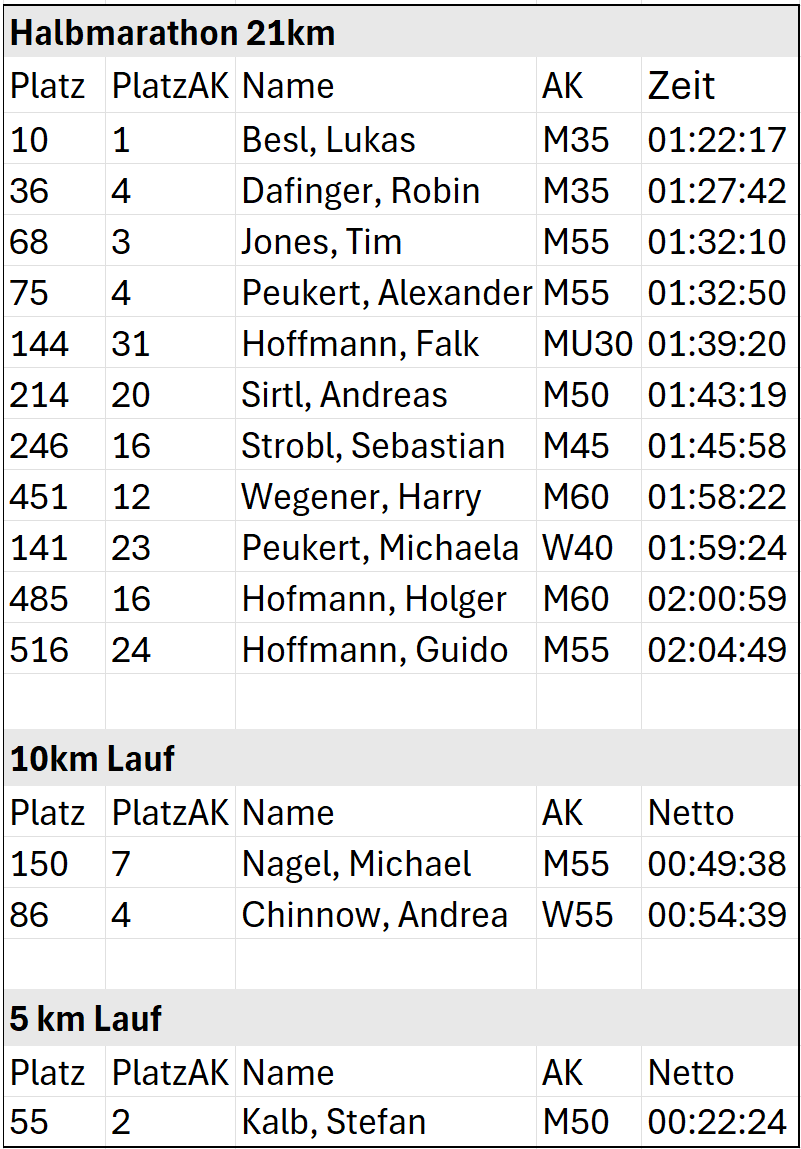 Aber wenn‘s mal läuft, dann läufts! Alle Trisportler kamen bei toller Stimmung mit starken Zeiten ins Ziel. Unser Neumitglied Lukas Besl hat es bei seinem zweiten Start in Landshut sogar auf Platz 10 der Gesamtplatzierung im Halbmarathon geschafft!